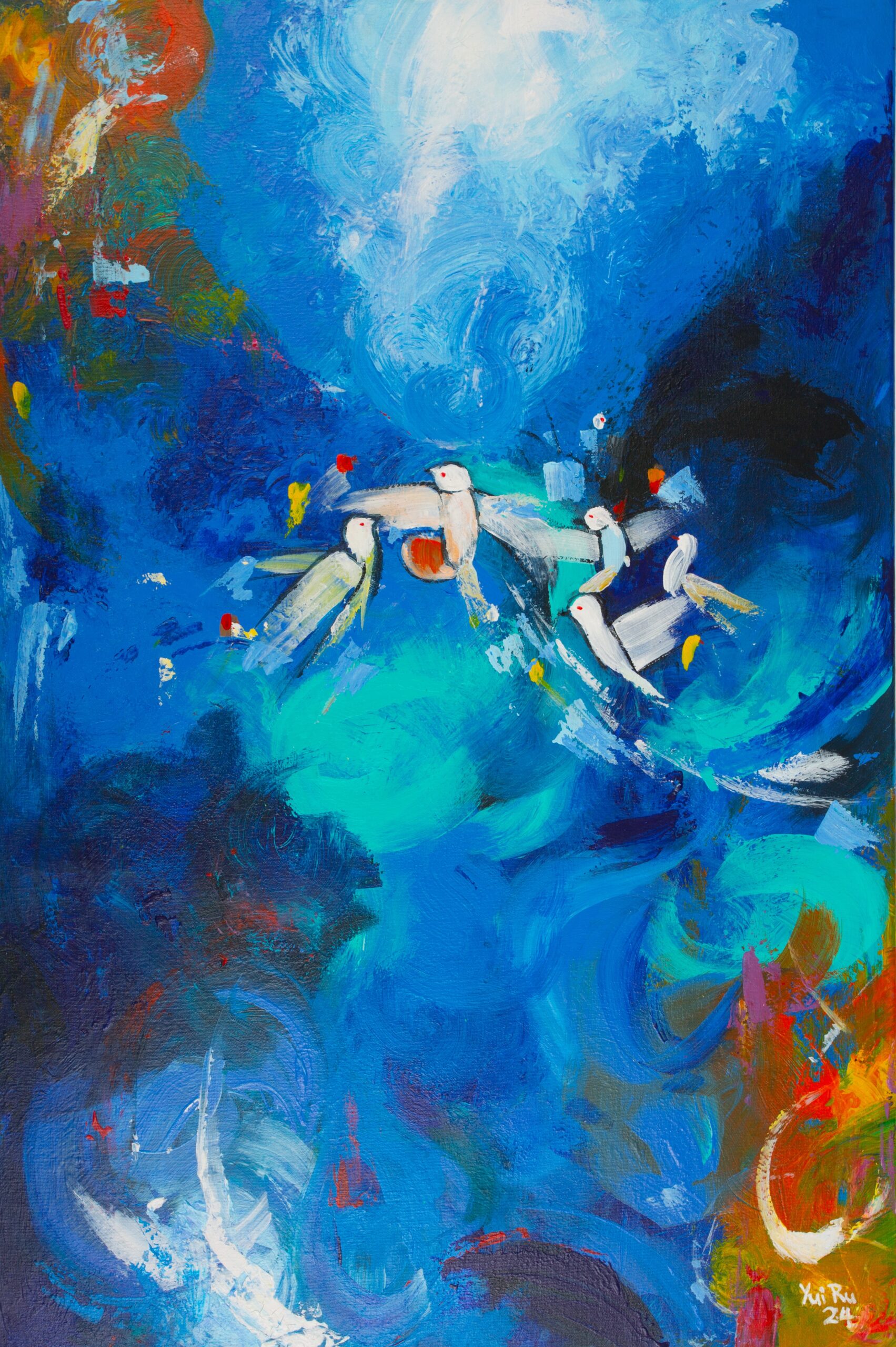The abstract brushstrokes create a sense of fluidity and motion, evoking the boundless sky or ocean as a backdrop for the doves’ flight—the bursts of red, yellow, and white contrast, suggesting lifes’ vitality and interconnectedness. The artist conveys a universal message of unity, emphasizing the beauty of coexistence. This piece inspires a sense of calm and optimism, encouraging viewers to reflect on the importance of peace in a turbulent world.